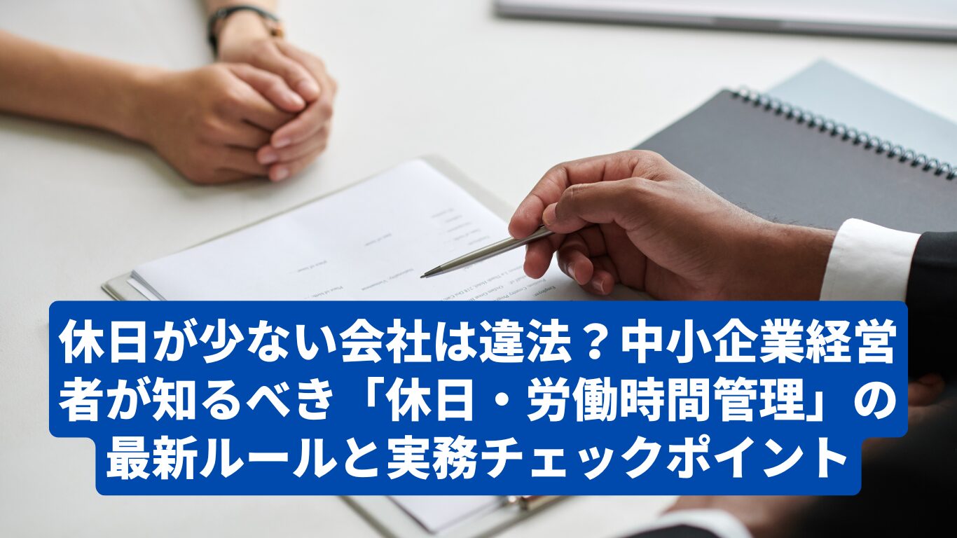 休日が少ない勤務体系は、必ずしも違法ではありません。ただし、法令上の最低基準を満たすだけでは、現代の労働環境には適していません。中小企業経営者は「合法かどうか」だけでなく、「従業員が健康で長く働けるか」「採用・定着に不利ではないか」という視点で休日制度を見直す必要があります。労働時間管理と休暇設計を整えることは、労務リスクの軽減と企業の信頼向上の両立につながります。経営資源としての「人」を守るために、休日制度の整備を経営課題の一つとして位置づけていくことが重要です。